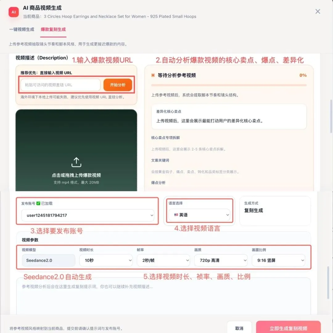 并且进一步打通平台生态,生成视频可直接对接TikTok批量上传、亚马逊Listing投放,无需二次加工。