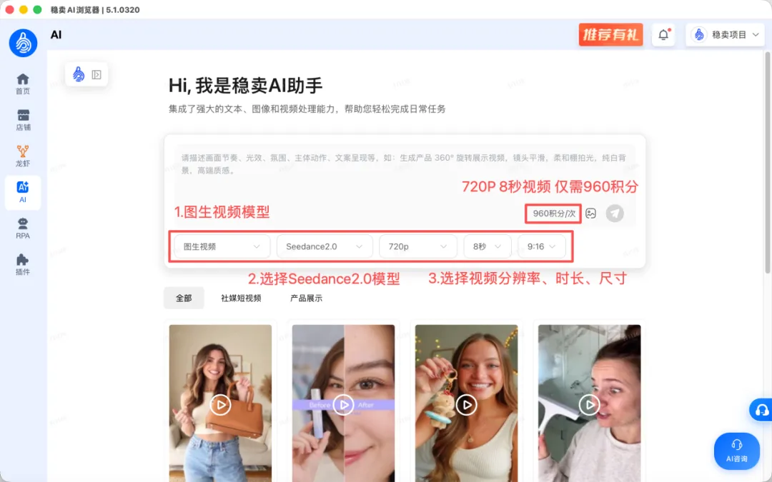 在稳卖 AI 浏览器客户端中,跨境卖家无需跳转平台、无需排队等待,可高并发调用 Seedance 2.0 满血能力,一站式完成脚本构思到视频成片全流程,真正实现文生视频、图生视频、TK视频制作、TK爆款复刻的电商视频制作全场景覆盖,支持上传真人形象定制,一人一键生成成片,生产效率提升 10 倍以上,大幅降低制作门槛与操作成本。