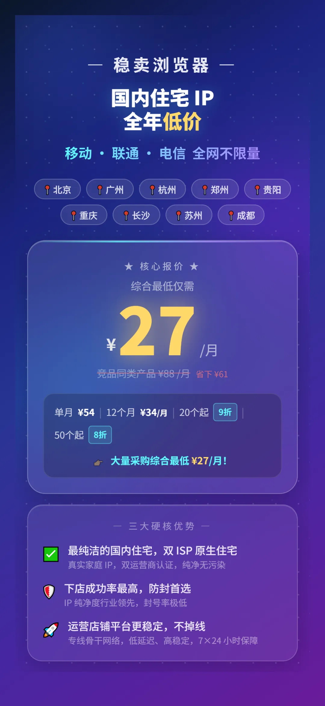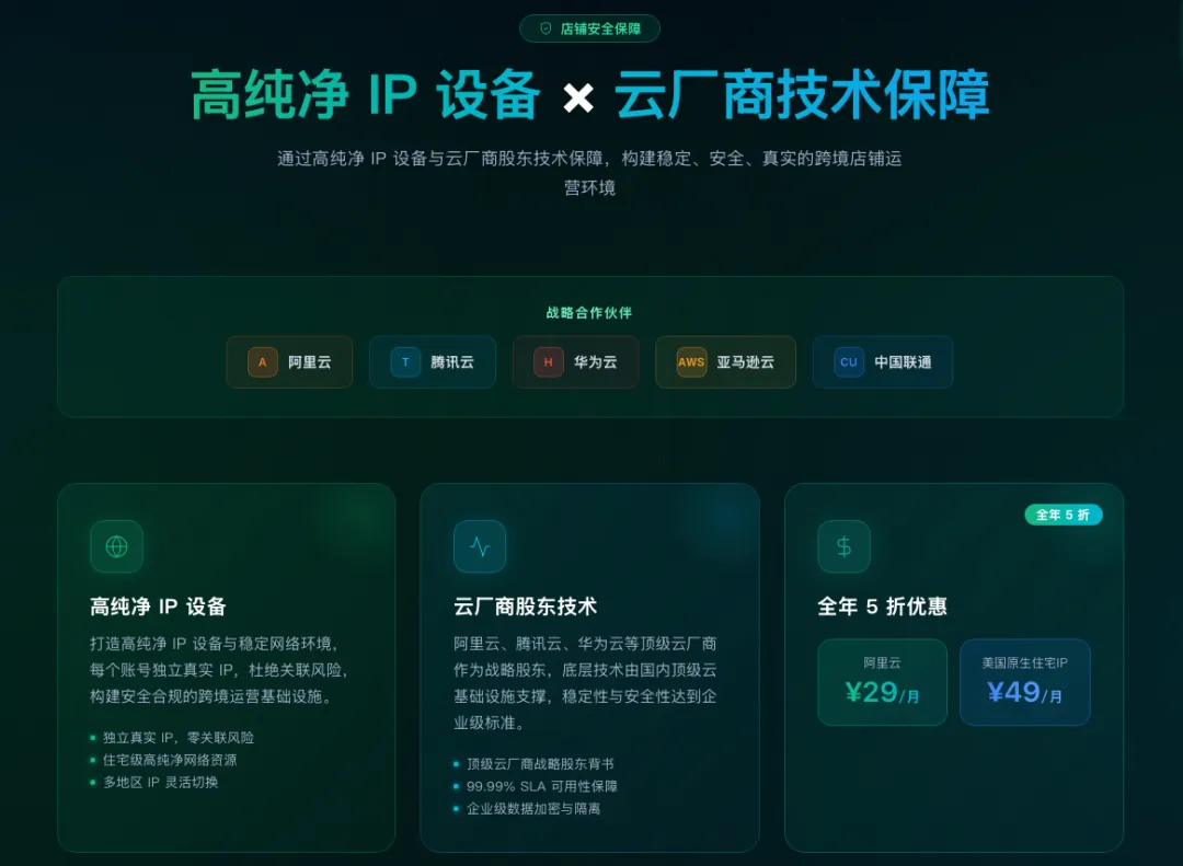稳卖以安全为底座、效率为目标,为卖家打造环境保障到内容生产的全链路支撑。在IP 保障层面,依托高纯净 IP 设备与阿里云、腾讯云、华为云、亚马逊云、中国联通深度合作,构建稳定安全的运营环境,从根源降低关联风险,实现企业级数据加密与 99.99% 高可用保障。