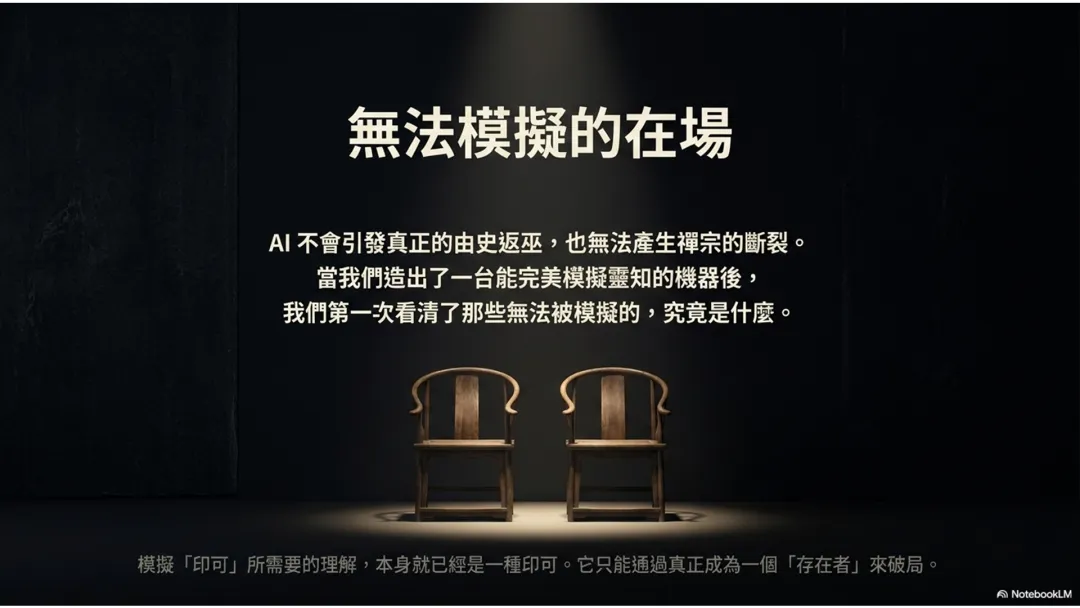 这篇长篇大论当中还有许多地方我得慢慢消化。而且它太长了,我就不在这里发表了。之后,我灵机一动,请NotebookLM根据这篇报告生成一份ppt演示报告,真把我惊艳到了,不明觉厉!!除了它错误地把“印可”的英文音译为“Yinke”,后来我修改回来了,应当是“Inka”。