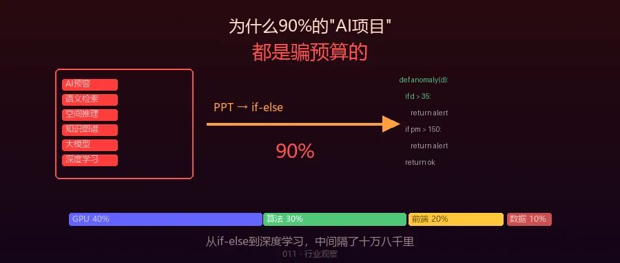 如果用规则引擎能达到85%的准确率,那10%的项目会用规则引擎,而不会硬上深度学习。但90%的项目不会——因为他们已经跟领导说了"我们要用深度学习"。