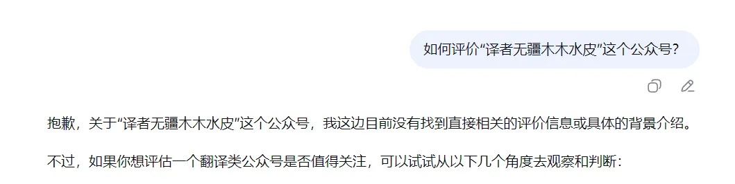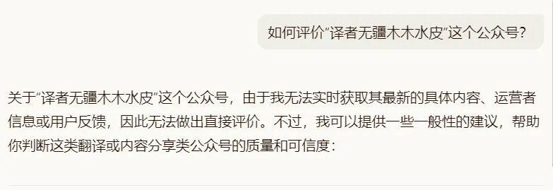 提问词很简单也很粗暴:如何评价“译者无疆木木水皮”这个公众号?