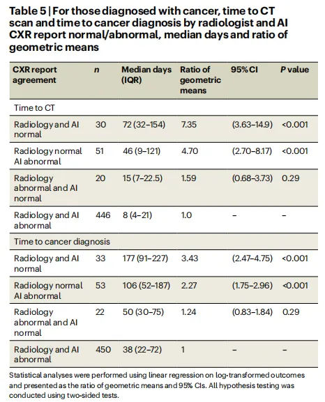 对于最终确诊肺癌的患者,作者按照人工报告与AI报告结果,比较了胸片到CT检测时间和胸片到癌症确诊的时间。结果显示,当人工和AI都判断异常时,患者胸片到CT检测的中位时间为8天,胸片到肺癌确诊的中位时间为38天;而当人工报告正常、但AI报告异常时,到肺癌确诊的中位时间延长至106天。若人工和AI都认为正常,到肺癌确诊的中位时间更高达177天(如下表)。这说明了AI在临床中有潜在价值,有机会帮助发现一些人工可能漏掉或低估的可疑胸片。