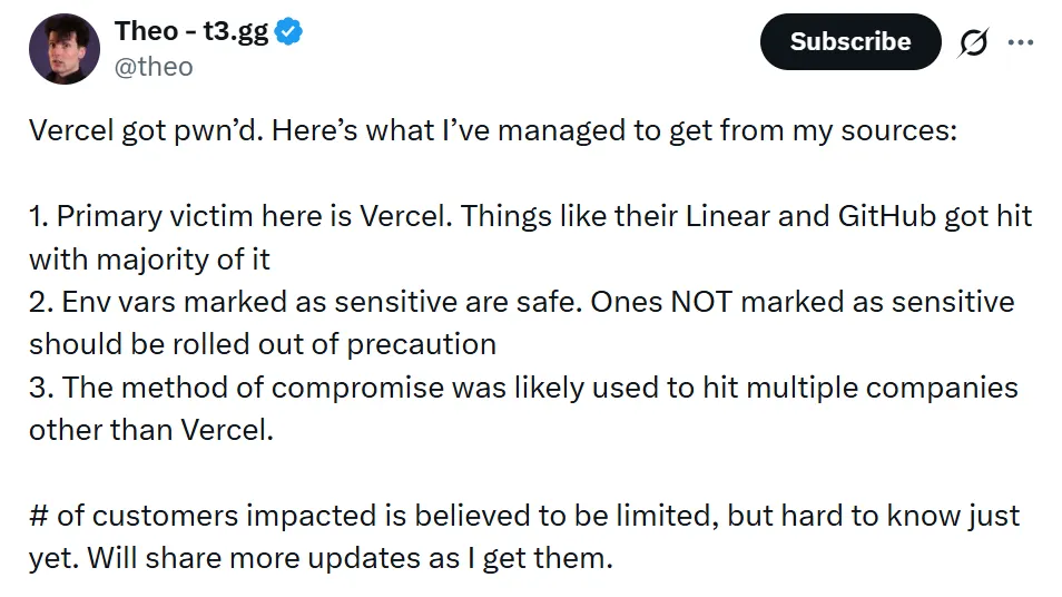 针对此次事件,软件开发社区知名开发者 Theo Browne 在 X 上表示,据其消息源透露,Vercel 内部集成的 Linear 和 GitHub 系统是受影响最严重的部分。他指出,Vercel 中标注为敏感的环境变量均受到安全保护;未被标记的其他变量则必须进行轮换,以防遭遇相同风险。该建议也与 Vercel 官方给出的指引一致,即建议客户检查环境变量并启用平台的敏感变量功能。