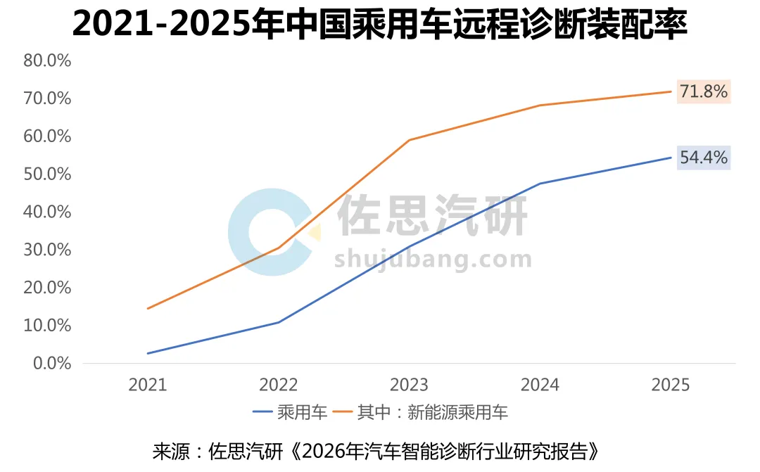2025年,中国乘用车远程诊断功能装配量超过1200万辆,同比增长14.8%;装配率为54.4%,比2024年底增加6.8个百分点。新能源汽车的装配率更高,2025年,中国新能源乘用车远程诊断功能装配量为820.4万辆,同比增长21.8%;装配率为71.8%,较2024年底增加3.6个百分点。