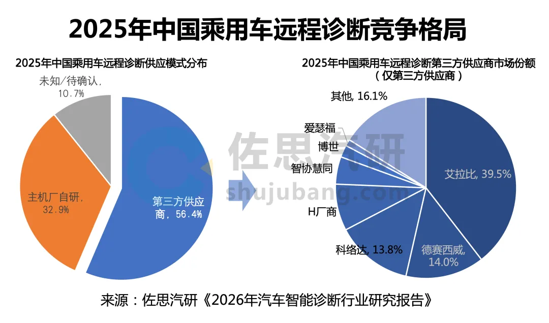 远程诊断主要包括主机厂自研和第三方供应商两种形态,2025年中国乘用车远程诊断系统中,有56.4%来自第三方供应商,32.9%来自主机厂自研。第三方供应商依托灵活的、可快速部署的定制化平台方案,占据市场主导位置。