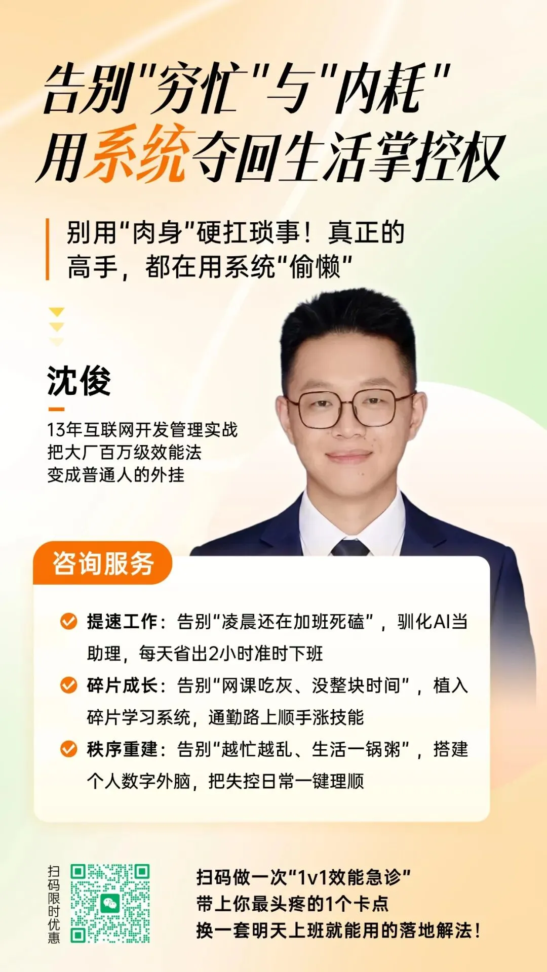 如果你需要更深度的定制化建议,欢迎来找我做一次 1v1 的个人效能咨询。我会帮你诊断现有的知识库,手把手带你梳理出一条从“碎片输入”到“高能输出”的 AI 工作流。