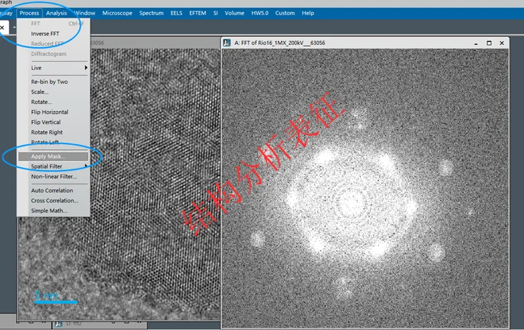 5.右键点击FFT图片,利用Mask工具将Mask覆盖对应的亮斑。如图所示,总共分为三组亮斑。注意mask的工具选择圆形对称工具。