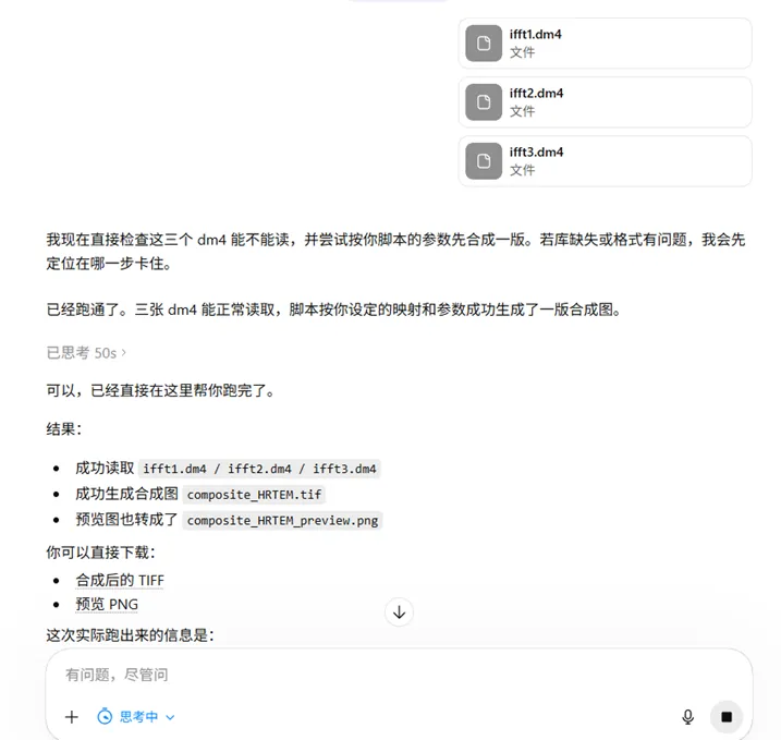 11.下一步就是合并色彩通道,这一步作者直接采用了AI进行vibe coding,得到了一个python脚本,但是该脚本的使用需要安装anaconda或spyder,且安装有ncempy软件包(openNCEM项目开发的一个开源Python软件包,专为电子显微学(NCEM)数据处理和模拟设计。它提供了一系列用于处理、分析以及模拟透射电子显微镜(TEM)和扫描透射电子显微镜(STEM)图像和数据的算法和程序,支持DM3/DM4文件读取)。如果没有开发环境的同学,这里可以采取替代方案,利用chatgpt或claude的对话框直接运行python脚本。如图所示。