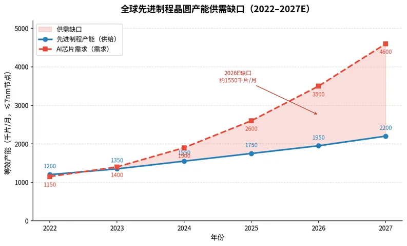 全球先进制程晶圆产能供需缺口(2022–2027E)