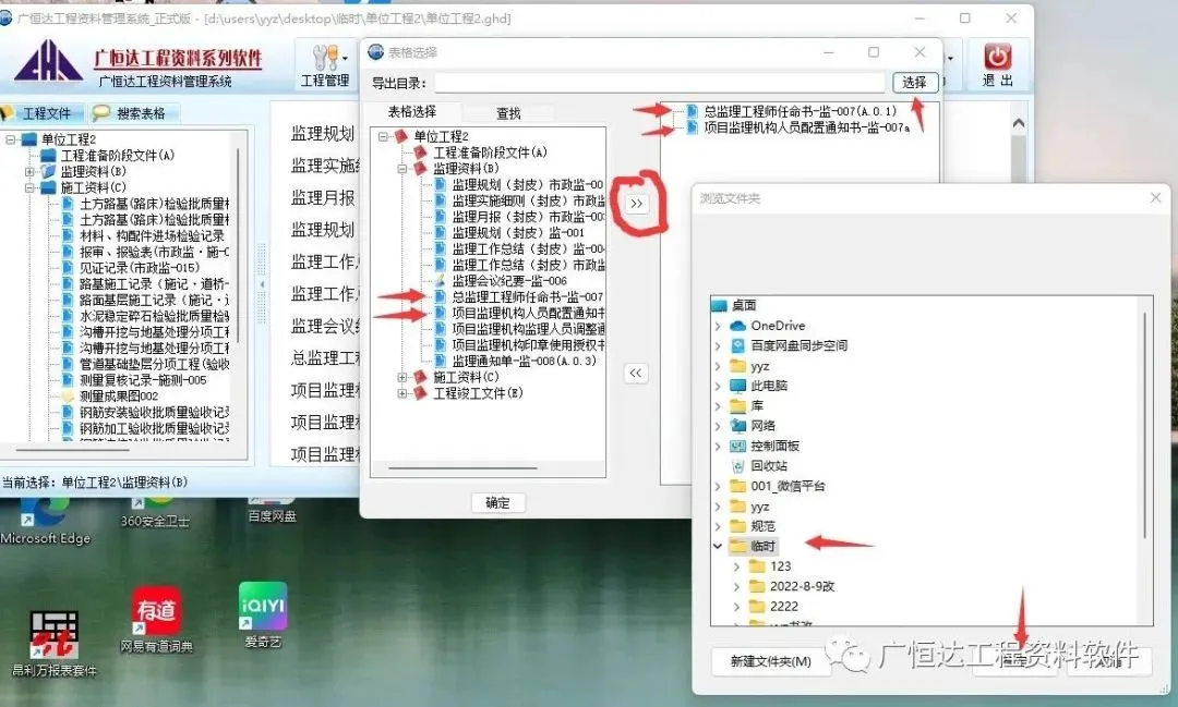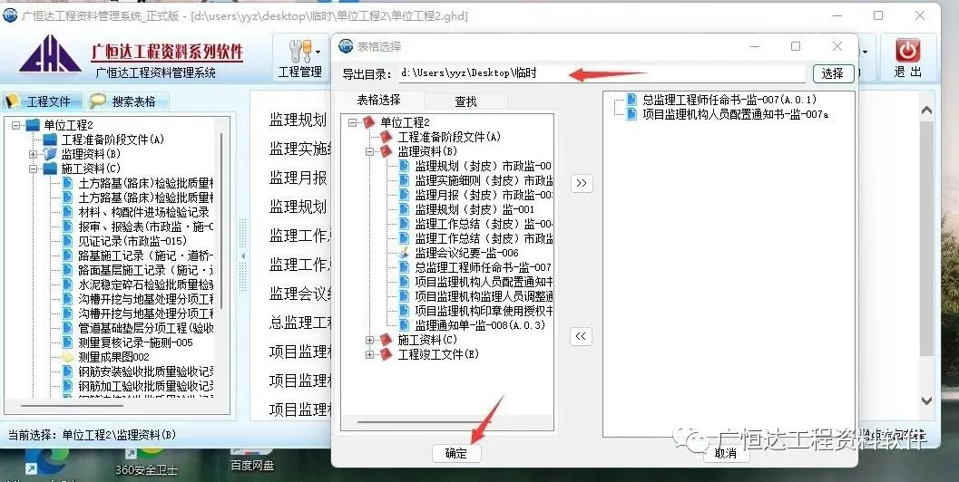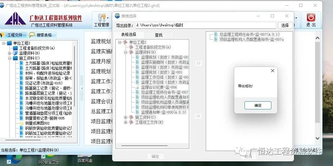 一.【导出表格】软件项目内点击→右键-弹出工具栏,选择【导出表格】点击,弹出→【表格选择】的对话框,在对话框中选择需要导出的表格(只能是表格),点击中间导向“》”到右面→点击导出目录的【选择】弹出的【浏览文件夹】中选择导出后的文件储存文件夹→【确定】→【确定】→【确定】→【取消】退出。
