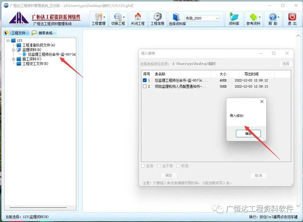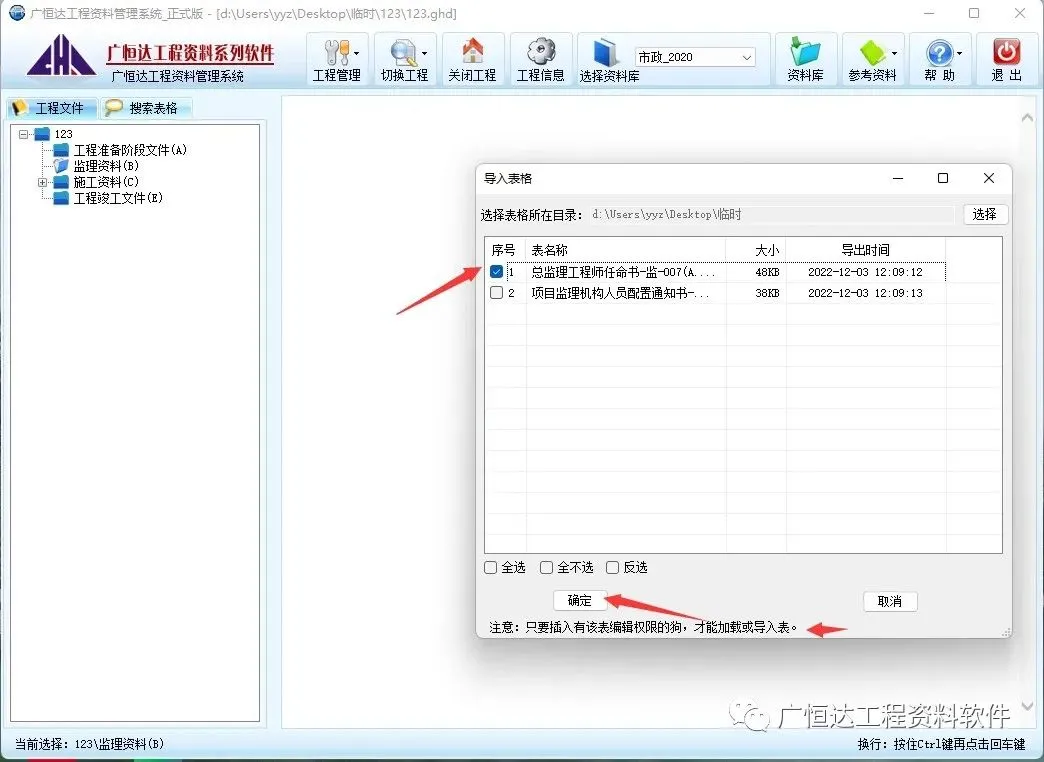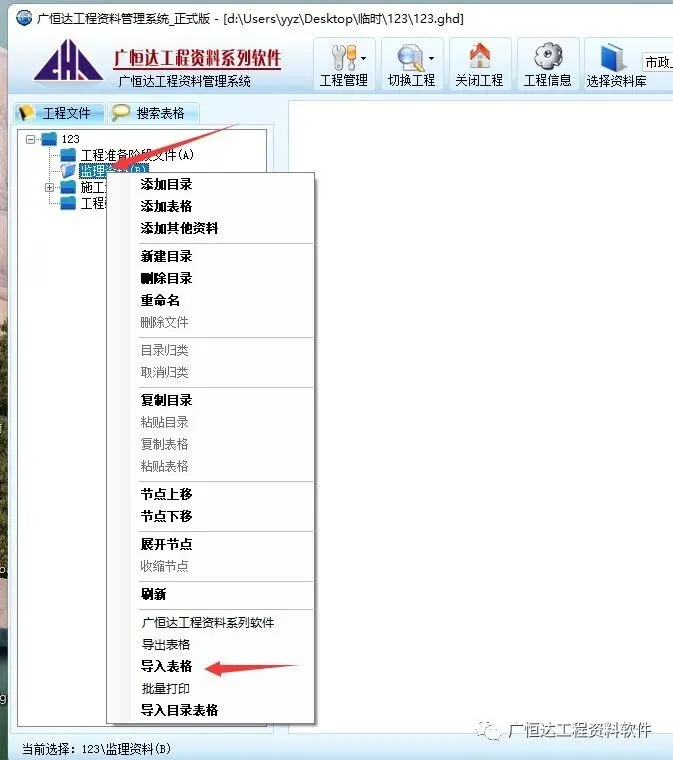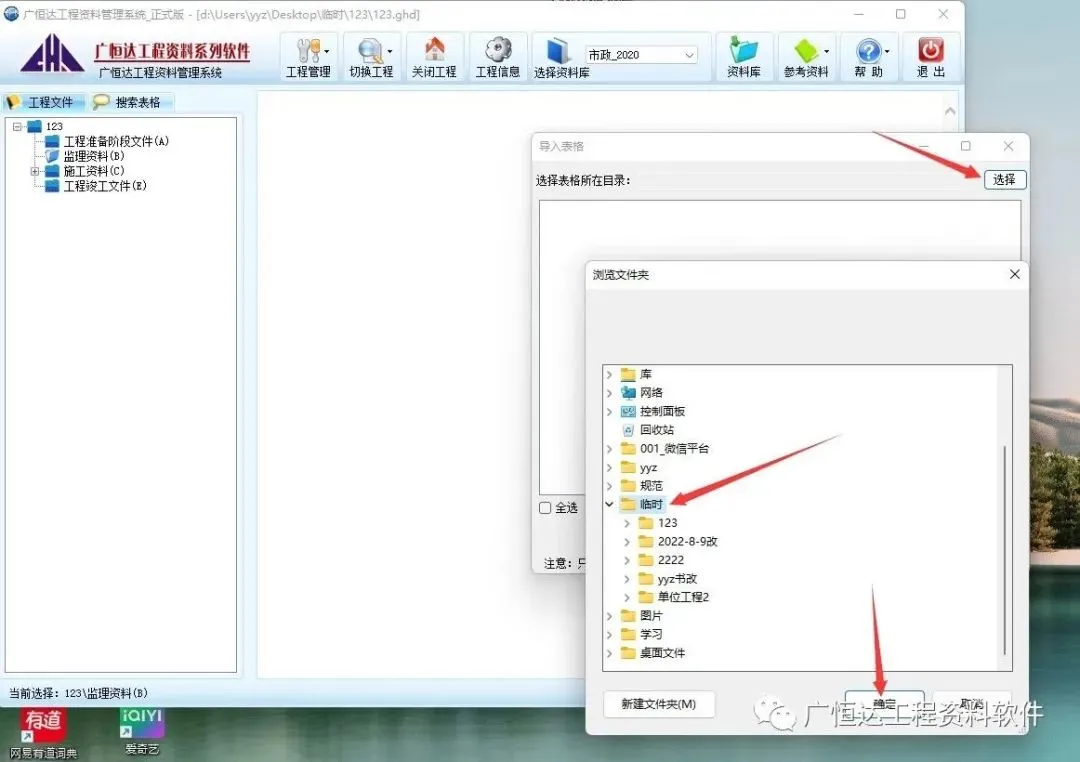【导入表格】软件项目内选择点击需要放置表格目录→右键-弹出工具栏,选择【导入表格】点击,弹出→【导入表格】的对话框,【选择】在对话框中选择需要导入的表格所在文件夹【确定】,选择需要导入的文件→【确定】→【确定】退出。