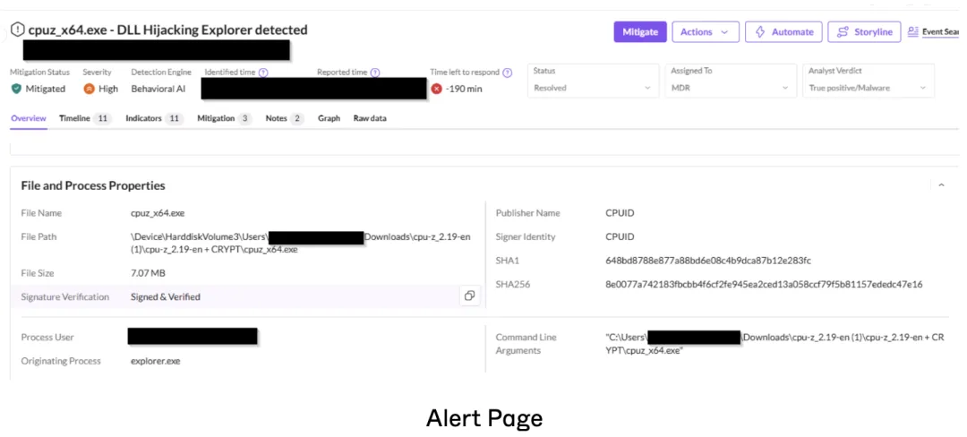 可疑的内存分配:申请了“可读-可写-可执行”(RWX)权限的内存区域——这是恶意载荷的典型驻留模式。进程注入特征:执行流程显示出代码被重定向至另一进程以隐藏来源的迹象。启发式 shellcode 签名:一系列连续操作,符合自动化利用工具包为执行命令而准备环境的典型行为。智能体随即自主终止并隔离了相关进程,阻止攻击进一步推进。攻击者放置在合法 CPU-Z 二进制文件同目录下的恶意 CRYPTBASE.dll(本意是在 Windows 加载系统真实 DLL 前抢先加载),甚至未能完成其任务。