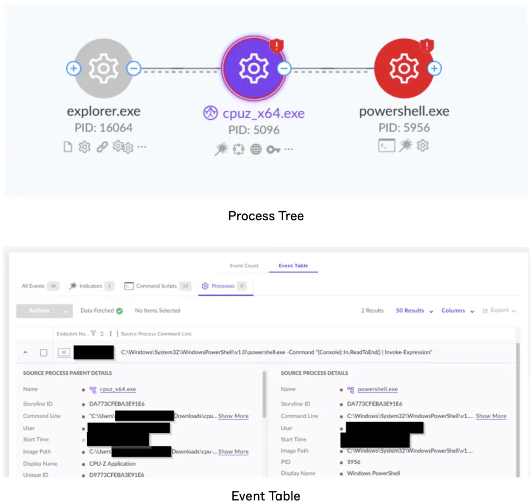 当天上午,SentinelOne 的行为检测引擎在 cpuz_x64.exe 内部发现异常。该二进制文件本身是真实的,数字签名有效,且确实来自厂商自身的基础设施。真正暴露问题的是该进程启动后的行为链:它先后调用了 PowerShell、csc.exe 和 cvtres.exe——而 CPU-Z 根本不会执行这类操作。