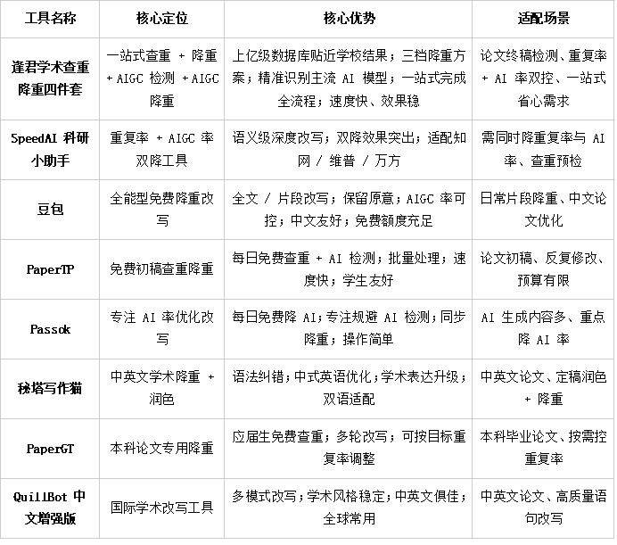 8 款 AI 查重降重工具核心实测对比表