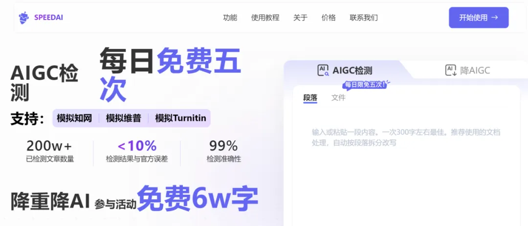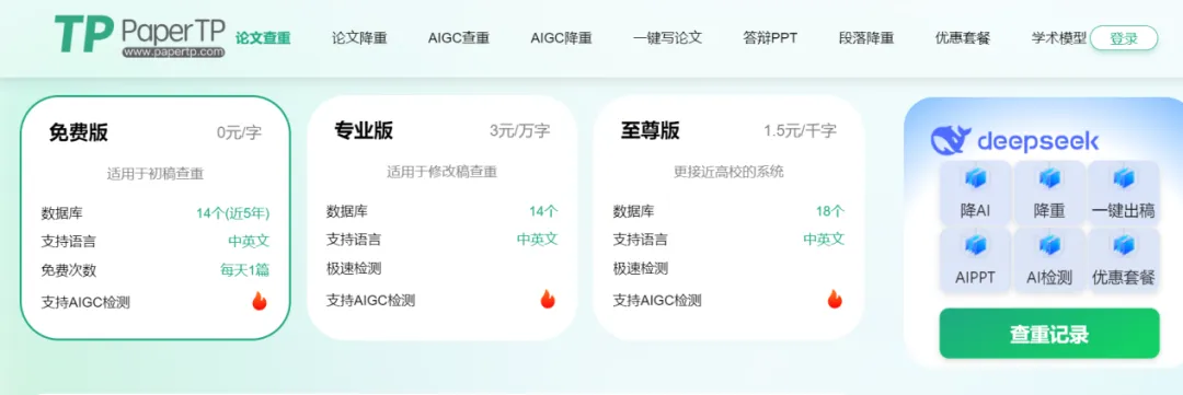 每日免费查重 1 次、AI 率检测 2 次,初稿降重利器,支持批量处理,降重速度快,中文适配好,学生党常用免费工具。