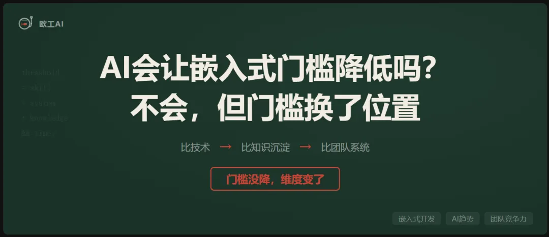 以前嵌入式团队的核心竞争力,在于谁的技术强。谁代码写得好、谁调试能力强、谁对芯片理解深,谁就是核心。