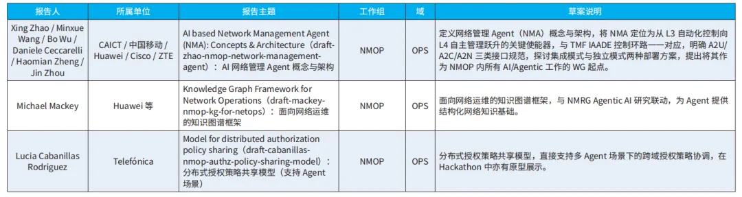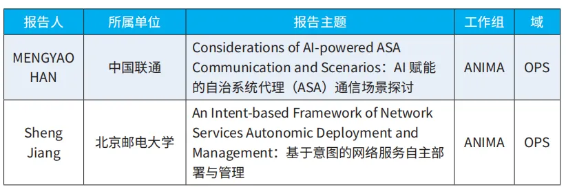 本届会议ANIMA工作组包含两个与AI/Agent相关的议题,一是AI赋能的自治系统代理(ASA)通信考量与场景,探讨将AI能力融入ANIMA自治代理框架;二是基于意图的网络服务自主部署与管理,研究意图驱动的自主化网络运营场景(表4)。