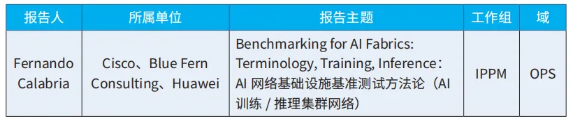 IPPM工作组在本届会议提出AI网络基础设施基准测试方法论(Benchmarking for AI Fabrics:Terminology,Training,Inference),针对AI训练集群网络与推理服务网络基础设施,提出系统性的基准测试术语体系与方法论,是IETF将AI基础设施纳入标准化测试视野的重要里程碑(表5)。