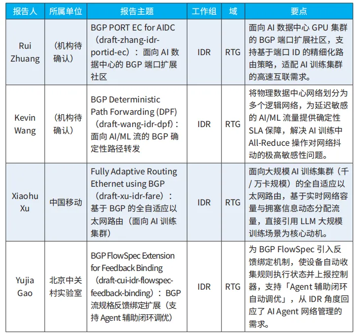 本届IDR工作组出现多项直接面向AI数据中心(AIDC)网络场景的提案,是RTG域首次系统性出现AI驱动的路由协议扩展(表6)。