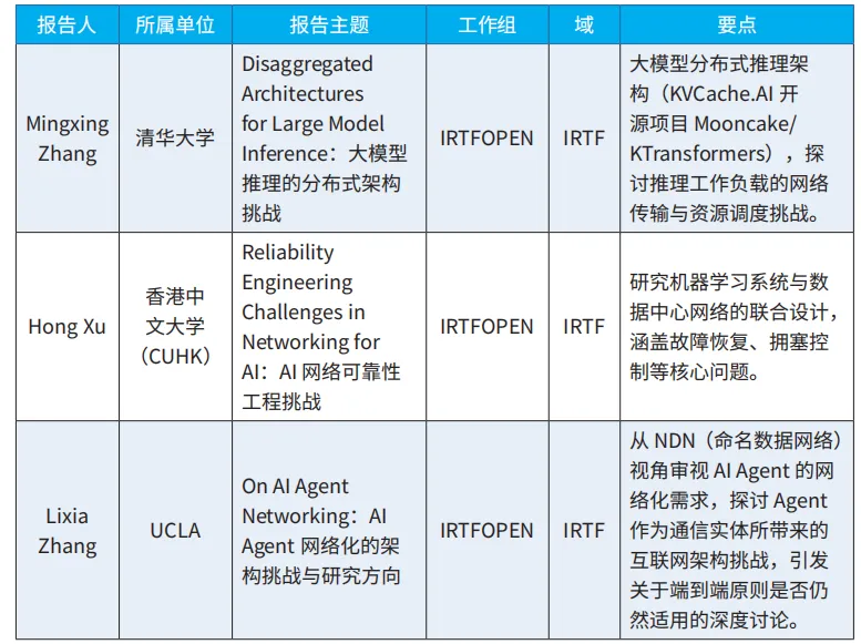 本届IRTFOPEN第一次会议设立专题⸻AI网络化挑战(Internetworking Challenges for AI),聚焦AI系统与互联网络交叉的研究挑战,具体报告见表7。
