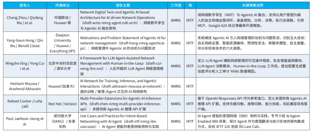 NMRG是目前IRTF内部对Agentic AI网络管理研究最为活跃的研究组,本届会议延续IETF124的研究方向,持续推进6个关键草案(表8)。