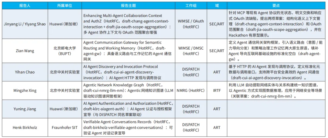 HotRFC闪电演讲环节与WIMSE/OAuth相关工作的跨域联动中,出现了6个AI/Agent重点提案(表9)。