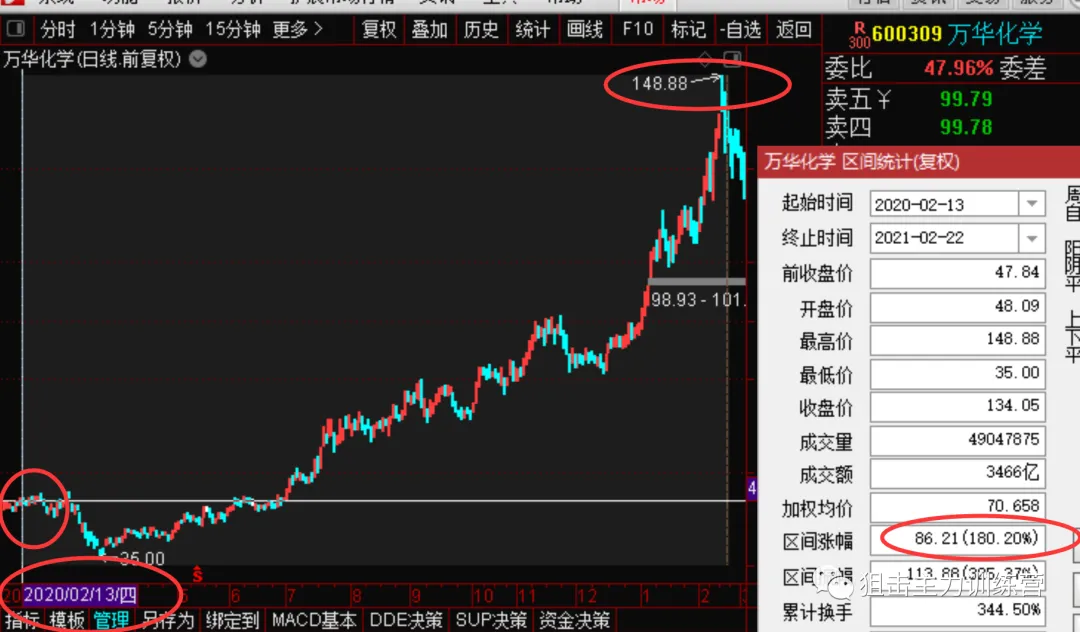 20年2月13号分享的万华化学,之后1年时间暴涨180%