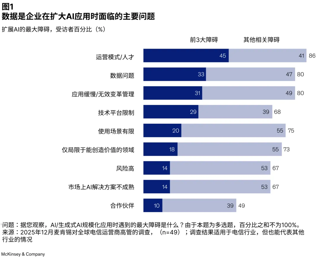 房子的坚固程度取决于地基。代理式AI也是如此,企业已迅速了解这一点。全球近三分之二的企业已尝试使用代理式AI,但仅有不到10%的企业能规模化使用并产生实际价值。数据基础不稳常常是罪魁祸首:80%的公司指出数据是限制代理式AI发展的障碍(图1)。根据《Rewired》研究,解决这一问题是构建稳固基础的核心要素——也是区分公司能否利用AI创造价值的最重要因素。