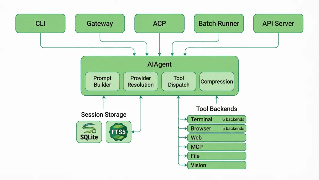 - 1. Platform-agnostic core:一个AIAgent类服务于CLI、Gateway、ACP、Batch和API Server。平台差异存在于入口点,而非Agent本身。