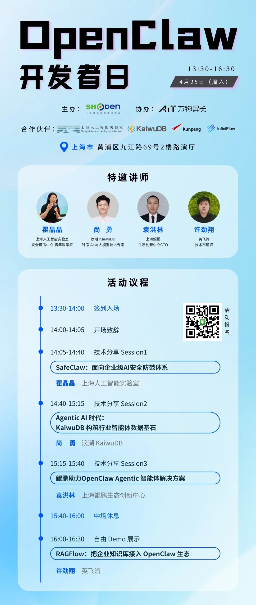 当前 AI 智能体技术快速迭代,开源生态成为开发者创新核心阵地。OpenClaw作为可本地部署、具备自主执行能力的开源智能体框架,凭借高效落地与灵活扩展特性,备受技术圈关注。为进一步放大平台价值,凝聚开发者力量,特举办本次OpenClaw智能体专场活动。本次活动聚焦技术分享、生态共建与社区联动,面向广大开发者全面展示OpenClaw核心能力、应用场景与开发路径,助力OpenClaw生态持续繁荣,赋能更多开发者实现智能体创新落地。