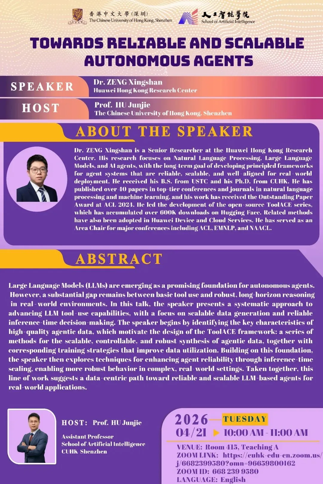 Dr. ZENG Xingshan is a Senior Researcher at the Huawei Hong Kong Research Center. His research focuses on Natural Language Processing, Large Language Models, and AI agents, with the long-term goal of developing principled frameworks for agent systems that are reliable, scalable, and well-aligned for real-world deployment. He received his B.S. from USTC and his Ph.D. from CUHK.