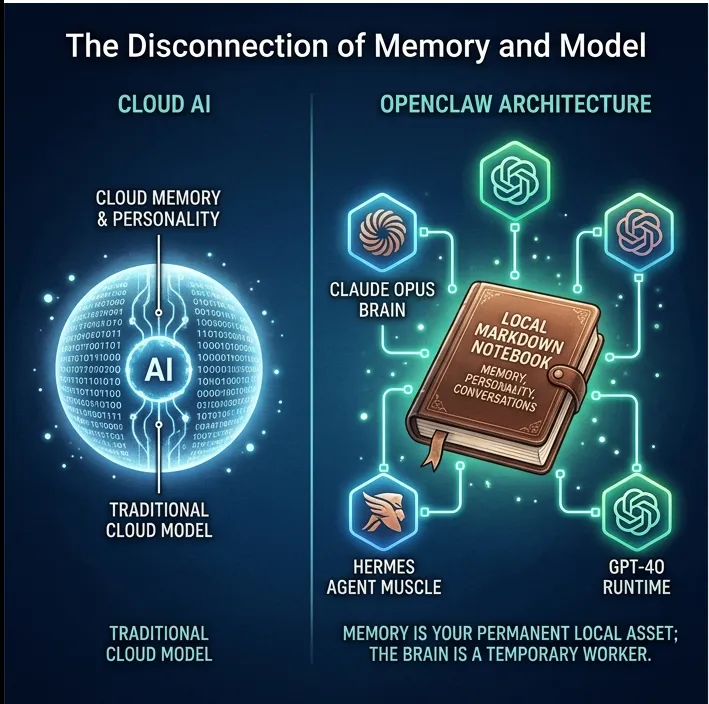 在传统 AI 模式下,记忆是长在大脑(模型)里的。换了模型,记忆就丢了。 但在 OpenClaw 的逻辑里:大脑(AI 模型)只是临时雇佣的“临时工”,而记忆才是你真正的“资产”。