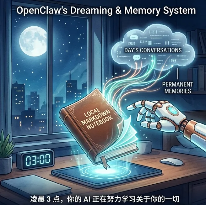 “梦境系统” (Dreaming):深夜的自我复盘每天凌晨 3:00,它会像人类睡觉做梦一样,自动回顾一整天的对话。它会思考:“今天发生了什么?哪些事该存进‘永久记忆’?”这些思考结果会直接写进你的本地文件。