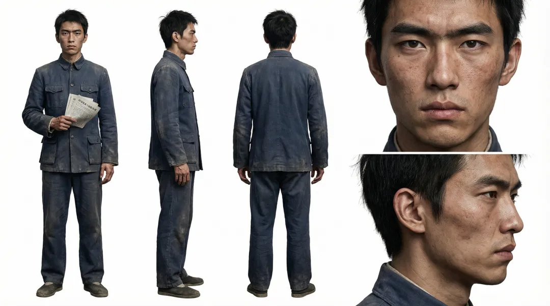 中国男性,约20岁,二十世纪二十年代北京大学学生。身高约175cm,体型偏瘦但站姿挺拔,书生清俊感,骨感突出,颈部线条利落,手指修长,指节有笔茧痕迹。 脸部(真人皮肤纹理质感,极度写实):国字脸略带棱角,轮廓分明。皮肤为东亚暖黄肤色,因户外活动略显黑红,额头与颧骨处有细微风晒痕迹,毛孔细腻可见,鼻翼两侧有极浅皮脂纹,嘴唇干裂有细纹。眉骨略突,浓眉自然未修,双眼皮,眼神深邃专注,平静时沉稳,激动时眼白充血。 发型:黑色粗硬直发,短发,额前几缕微乱刘海自然垂落,两鬓稍长未整理,略显凌乱,如同来不及梳头便出门。 服装:深蓝色中式立领长袍,棉麻质感,有轻微穿洗褪色,领口袖口因摩擦略显磨损。黑色布底鞋,鞋面有灰尘。长袍下摆因行走起褶。怀中揣有一叠传单,纸角从领口处微微露出。 表情与气质:眉头微蹙,嘴唇抿紧,将所有情绪压在喉咙里尚未说出口。眼神坚定向前,内敛而不可动摇。书生气与倔强感并存,不张扬,但旁观者会注意到他眼神里的力量。