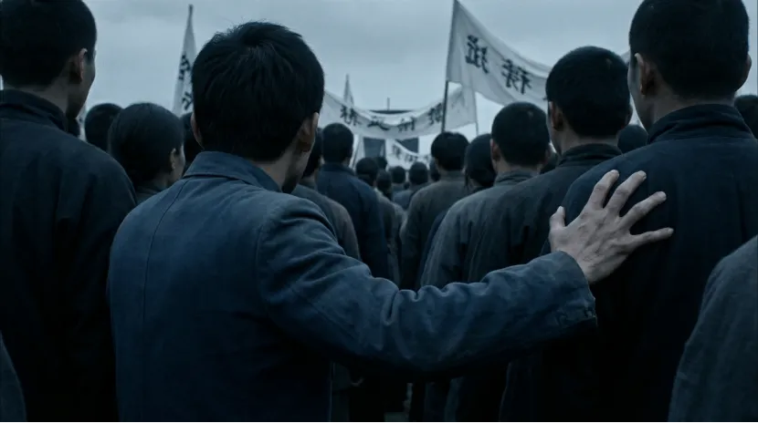 人群背影电影感构图,阴天冷色调低饱和。主角居中偏左,深灰外套,右手搭在前方人物肩上。周围密集人群同样深色着装,齐望向远处飘扬的汉字白色横幅。氛围压抑肃穆,浅景深背景虚化,纪实风格。第三人称视角。