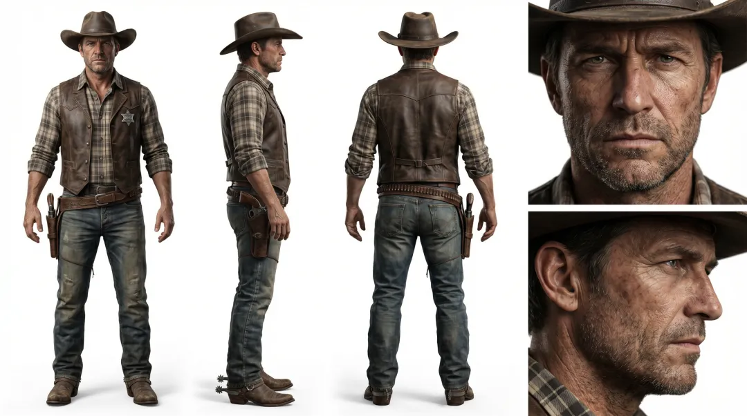 美国西部牛仔角色参考图提示词:写实风格,纯白色背景,16:9横向构图,一张图片包含五个独立视图横向排列:①全身正面站立 ②全身侧面站立 ③全身背面站立 ④正面脸部特写(右上角放大) ⑤侧面脸部特写(右下角放大)。人物设定:男性,40岁左右,美国西部牛仔。面部轮廓硬朗深邃,高颧骨,方下颌,眼神锐利冷静,带有常年风吹日晒留下的细纹和岁月感,真实皮肤纹理质感,毛孔清晰可见,古铜色肤色,脸颊有轻微胡茬。发型为深棕色短发,略显凌乱,额前有碎发。服装:头戴宽檐棕色皮质牛仔帽,帽檐略有磨损。身穿深色格纹法兰绒衬衫,外套做旧皮革马甲,胸前有金属徽章。腰间系宽皮带,配有做旧铜扣,腰侧挂左轮手枪皮套。下身穿深蓝色做旧牛仔裤,膝盖处有磨损痕迹。脚踏棕色皮质马靴,靴跟装有马刺。表情与气质:表情沉稳内敛,嘴角微抿,眼神直视前方,透出历经风霜的孤独感与不怒自威的压迫感。整体气质粗犷、硬派、沧桑。画面要求:写实风格,超高细节,电影级光影,自然漫射光,五个视图人物比例统一,服装细节前后左右完整呈现。
