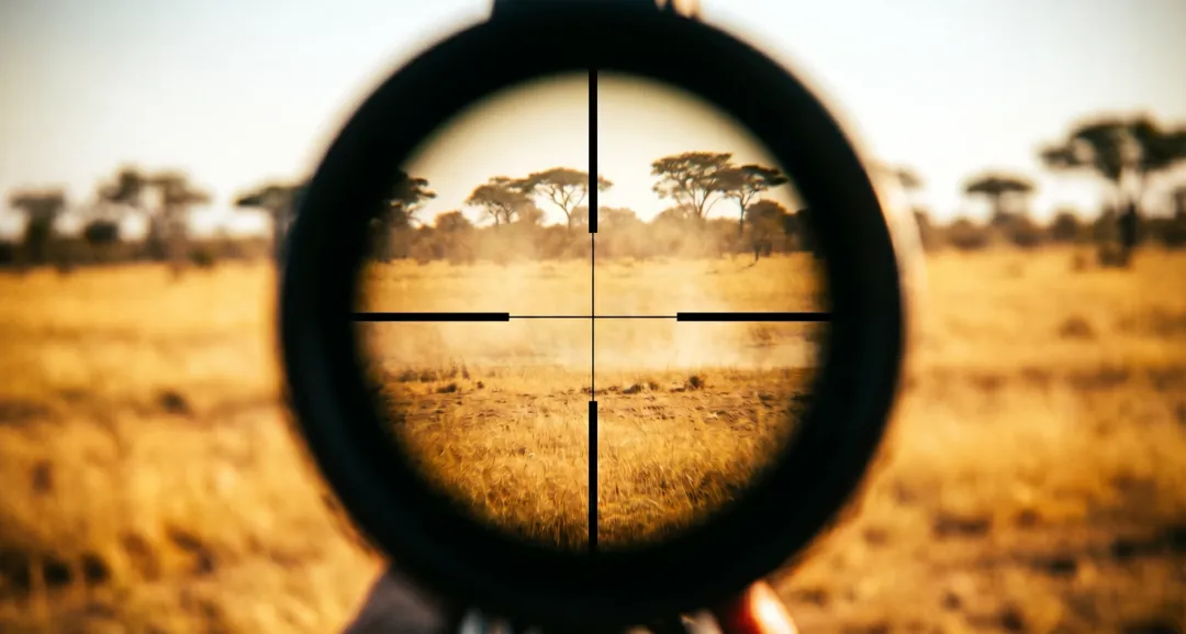 第一人称瞄准镜视角,快速横向扫视南非大草原,转动时画面运动模糊,草地树影一闪而过。镜头逐渐减速定格,十字准星对准一只低头吃草的黑斑羚。午后暖黄阳光,热浪扭曲,瞄准镜外虚化,呼吸起伏感,写实电影感。