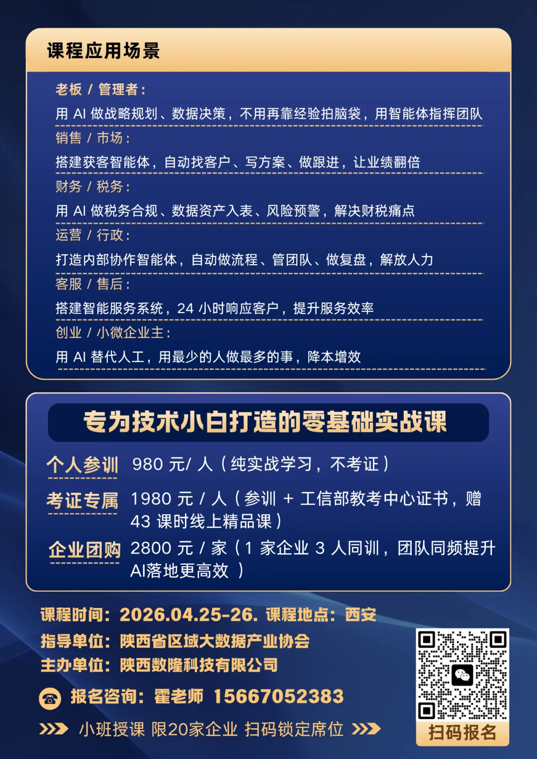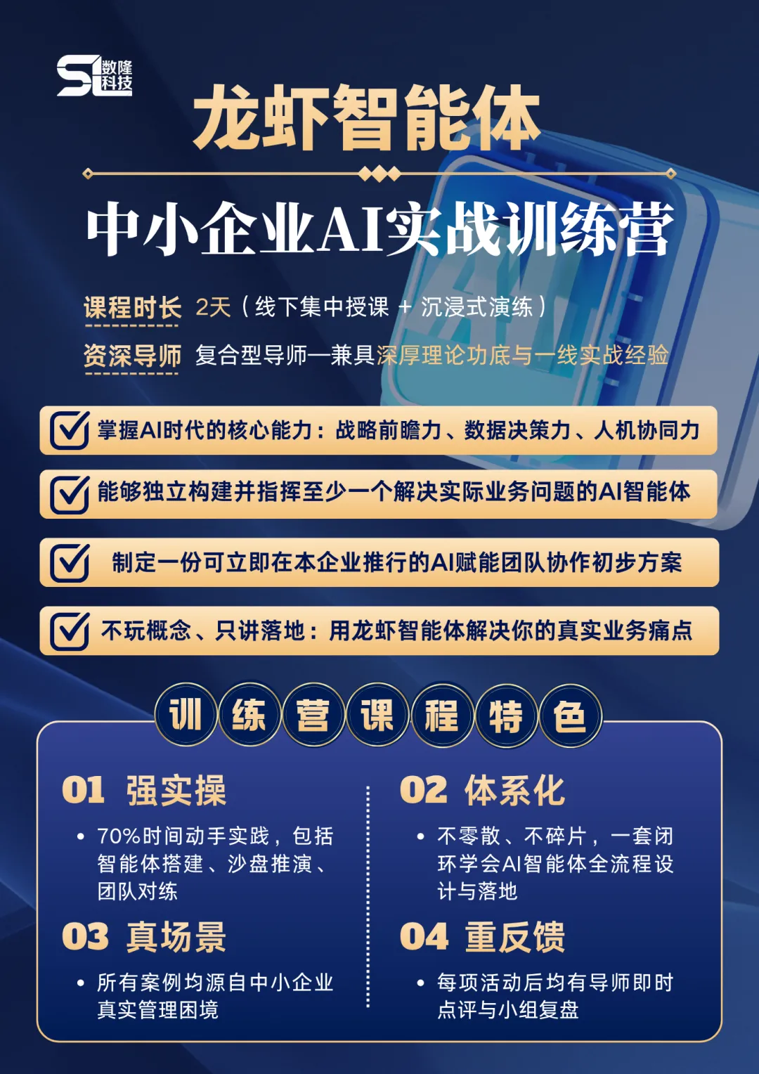 为帮助更多企业家、管理者系统掌握 AI 智能体实战能力,陕西数隆科技重磅推出「龙虾智能体中小企业 AI 实战训练营」,4 月 25-26 日(周六、周日)西安开营,小班实战教学,名额有限!