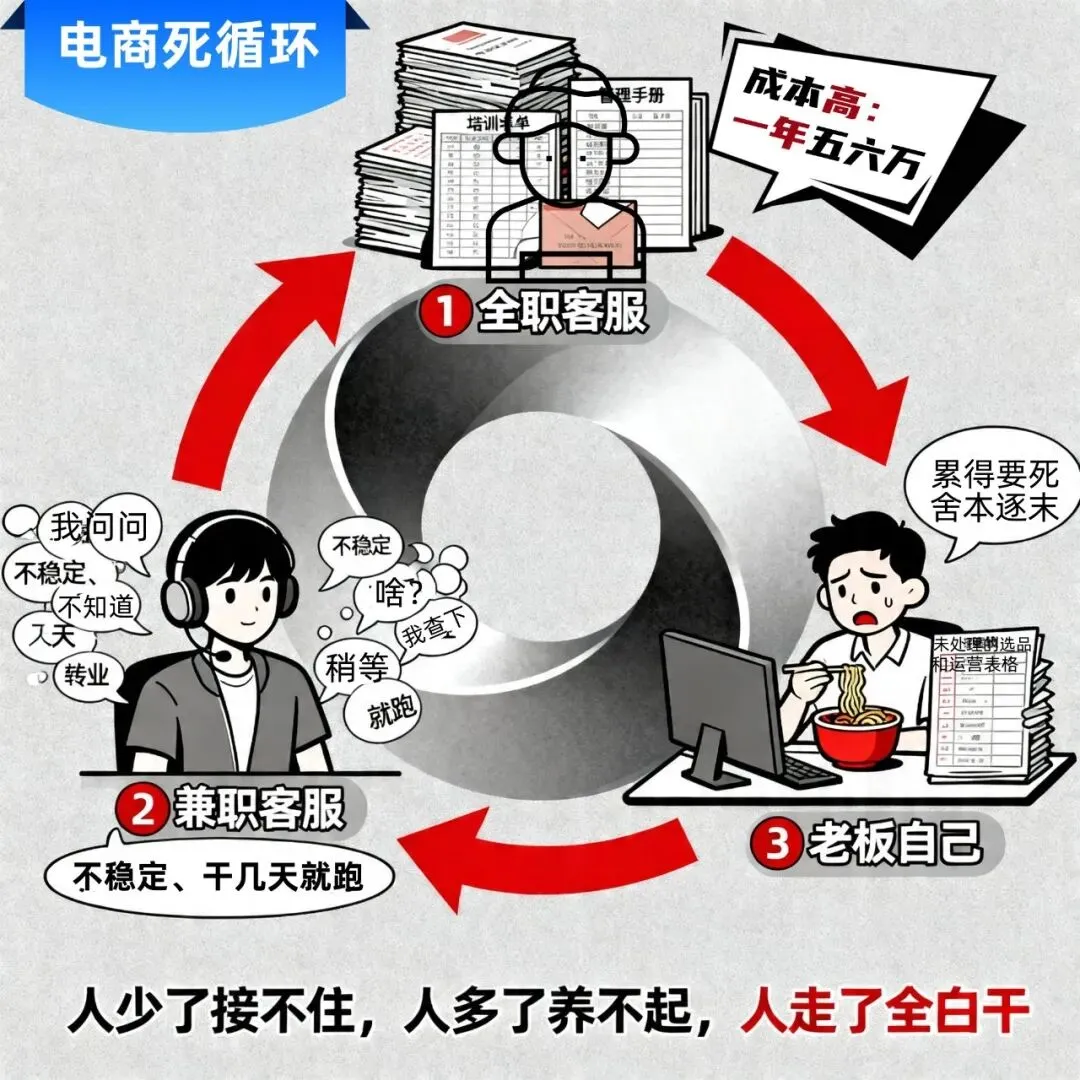 而这就是电商客服的“死循环”,人少了接不住,人多了养不起,人走了全白干。只要你做过电商,这一定不陌生。