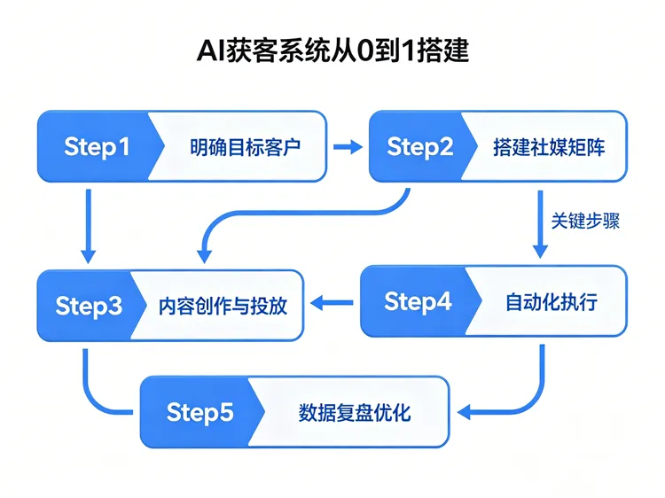 掌握核心组成后,按照以下5个步骤逐步落地,避开所有实操坑,确保每一步都能为最终获客服务,适合所有从0开始布局AI获客的企业: