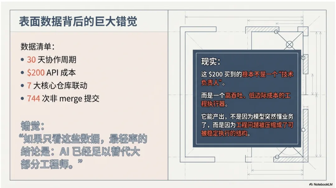 更危险的是,最容易被这些漂亮数字打动的,往往恰恰是最不懂工程的人。因为不懂,所以他们会天然把 200 美元和一个高级工程师月薪做对比;看到 744 次提交,就自动脑补成“等价替代了几个人月”。但真实情况是,这 200 美元买到的不是工程师,更不是技术负责人,它买到的只是一个高吞吐、不知疲倦、也不承担后果的执行器。真正昂贵的部分,是后面那些不会出现在 PPT 上的成本:有人要 review,修复,统一约束,补测试,补 CI,补发布链路,梳理真源唯一,清理历史路径,防止系统继续失控。表面上省下来的,是显性的研发成本;实质上被透支掉的,是未来几个月甚至几年里的维护成本。很多老板只看到了“本月 ROI”,没看到“明年技术债”。这就像当年放卫星,产量数字是给上面看的,真正吃亏的是地里的庄稼和最后的收成。AI 时代同样如此:报表可以很漂亮,但系统的苦果,终究还是开发团队自己吞下去。