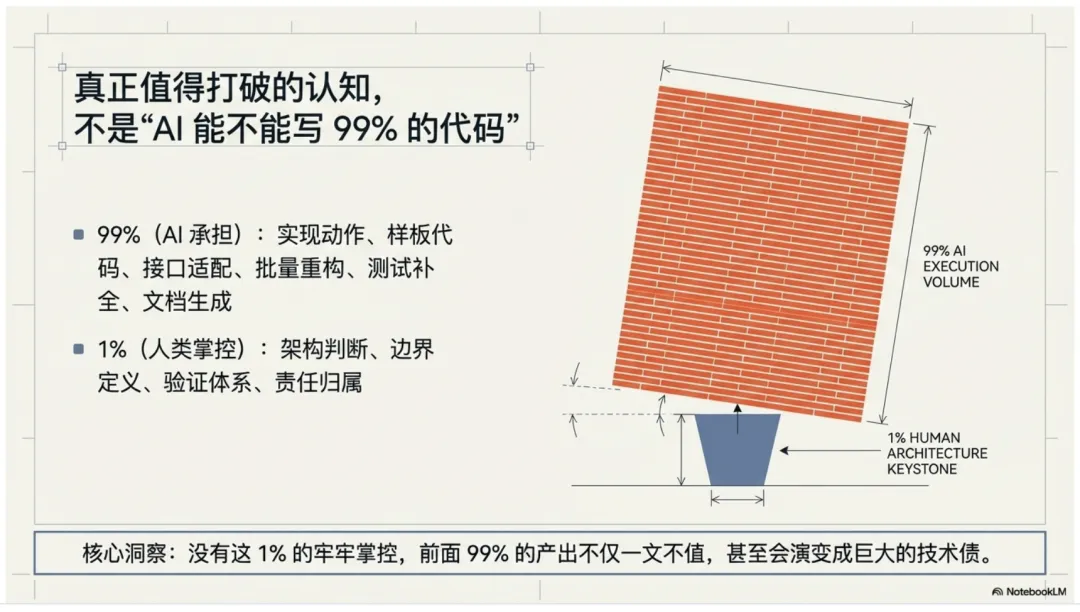 所以,我并不反对 AI 写 99% 的代码,真正值得警惕的是:有人开始把这 99% 误解为工程本身。写代码只是工程里最容易被量化的一部分,而真正昂贵、真正稀缺、也真正决定系统生死的,是剩下那 1%:做取舍、立边界、删旧路、保一致、控复杂度、为长期演进负责。