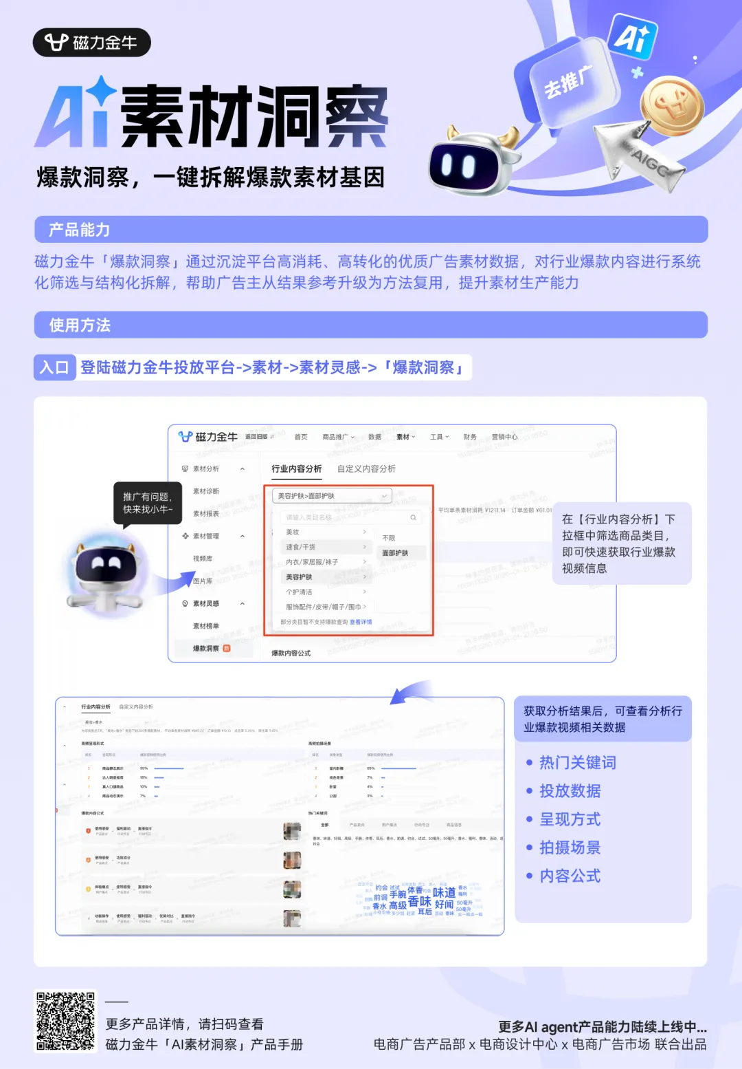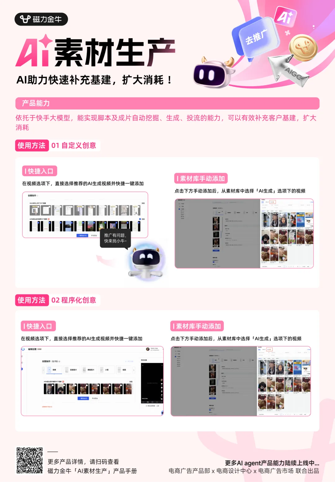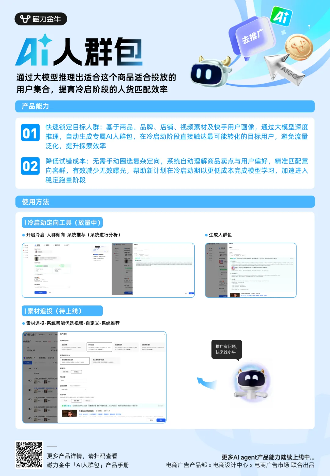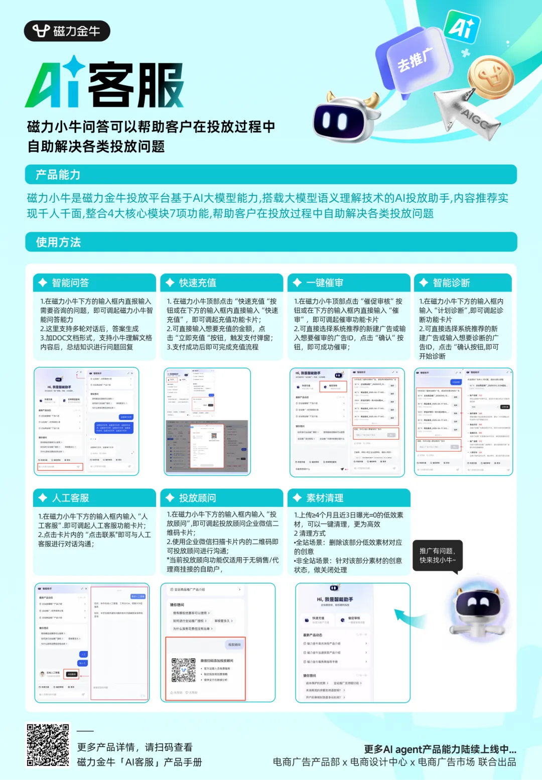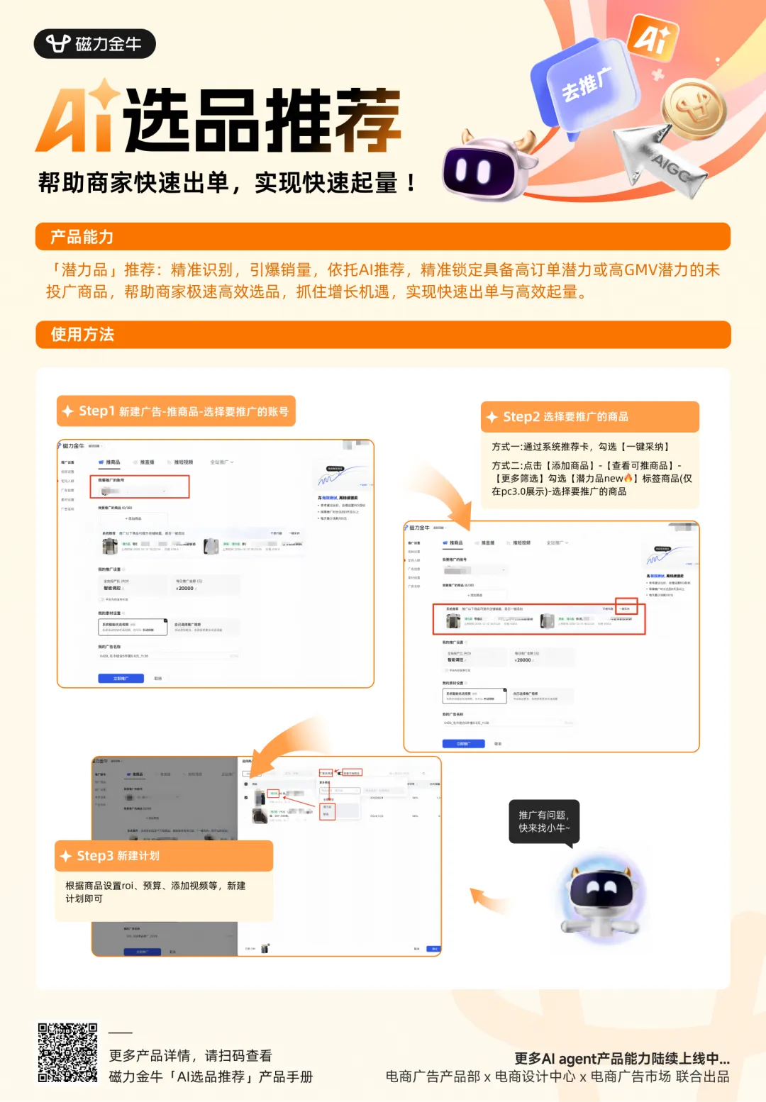 AI 产品上新:全链路智能,让电商经营更简单!AI 时代,电商营销已进入全链路智能新阶段。如何快速挖掘爆款、快速锁定目标人群、高效生产素材、高效广告推广、实时数据分析、智能服务客户?磁力金牛 AI 产品能力给出答案 !* 图片来源于网络,侵权请联系删除 END