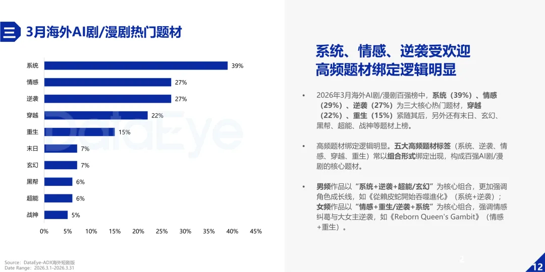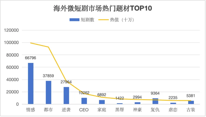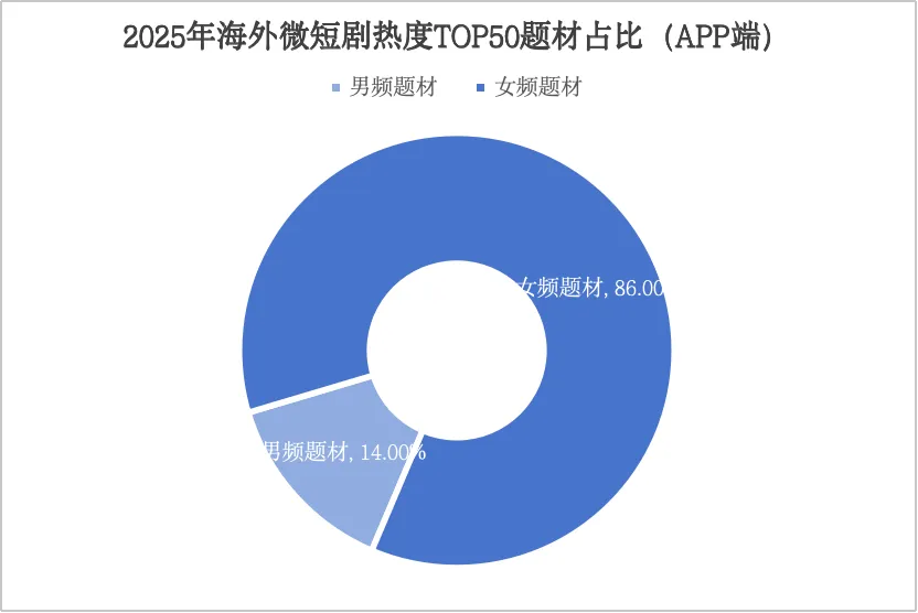 微短剧精准契合25-45岁女性核心受众的情感需求,女性情感类题材长期在全球微短剧市场占据核心地位,成为平台流量与商业变现的核心支撑。2025年,APP端热度最高的TOP50海外微短剧中,86%为女频题材,男频题材占比14%;YouTube微短剧频道中,80%为女频题材,男频题材约占20%。在海外微短剧市场热门题材TOP20中,“情感”与“都市”这两大题材热度值均突破90亿,短剧数量均超过3万部。