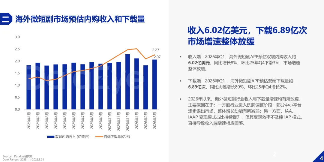 2025年,中国以外国际市场规模36亿美元,中国企业贡献约90%的份额;海外市场内购收入排名前十的头部海外短剧平台均为中国背景,合计内购收入约16.50亿美元,占海外市场规模的45.83%。