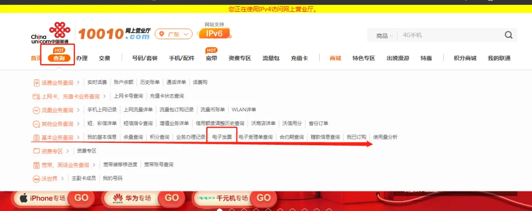 3、登录成功之后,会自动跳转首页,首先点击查询→基本业务查询→电子发票