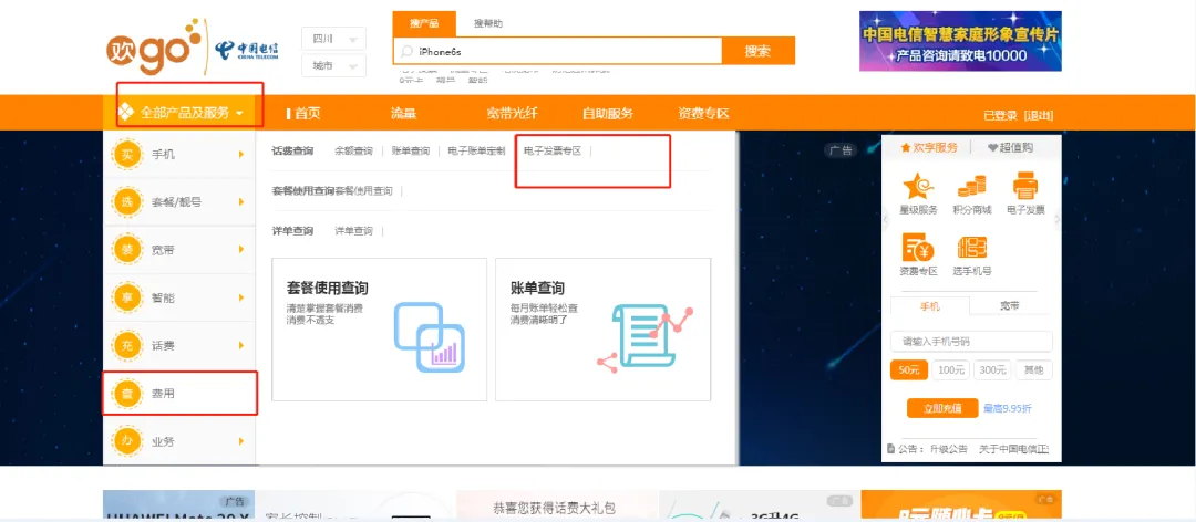 3、登录成功在全部产品及服务→费用→电子发票专区