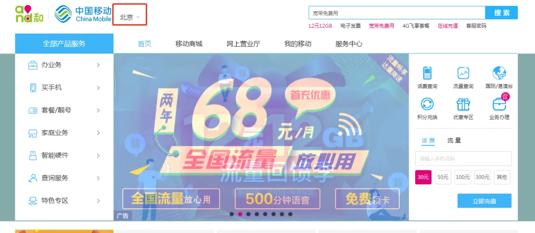 ◆移动——网址:www.10086.cn 1、首先登陆网上营业厅前要选择一下号码办理的省份(手机在拨打界面输入号码就可以看)