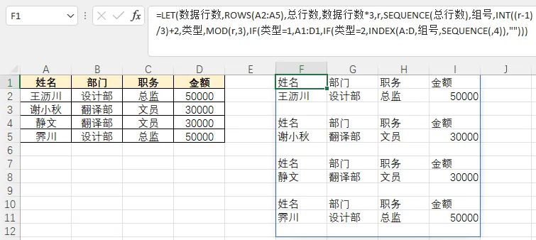 Excel高效排版|1个LET公式,自动给数据添加表头+空白行(新手直接复制可用)做运营、做行政、做财务的小伙伴,肯定遇到过这样的场景:整理好的表格数据(比如用户名单、订单明细、活动数据),需要每一行数据对应一个表头+一个空白行,方便打印、核对,或者发给领导查看。手动复制表头、插入空白行?如果只有几行数据还好,一旦数据有几十上百行,重复操作下来,不仅费时间,还容易出错——要么漏插空白行,要么表头复制错位。今天就给大家分享一个一键搞定的Excel公式,用LET函数搭配SEQUENCE、INDEX,不用手动操作,输入公式直接生成“表头+数据+空白行”的规范格式,新手也能直接复制套用,效率翻倍!如图我们想将A1到D5区域生成为F1到I11格式,只需在空白单元格输入公式=LET(数据行数,ROWS(A2:A5),总行数,数据行数*3,r,SEQUENCE(总行数),组号,INT((r-1)/3)+2,类型,MOD(r,3),IF(类型=1,A1:D1,IF(类型=2,INDEX(A:D,组号,SEQUENCE(,4)),""))),按回车,瞬间生成完整排版,零错误、零重复劳动!很多小伙伴看到长公式就害怕,其实这个公式的逻辑很简单,LET函数的作用就是“给变量起名字”,把复杂公式拆成一步步,我们逐段拆解,看完就懂:1. 定义基础变量(告诉Excel“你的数据在哪里”)数据区域,A2:A5:指定你的原始数据范围(这里是A2到A5,可根据实际修改,比如A2:A20、B3:B50);数据行数,ROWS(数据区域):自动计算原始数据有多少行(不用手动数,比如A2:A5就是4行);每组行数,3:我们要的“表头+数据+空白行”是3行为一组,固定写3即可;总行数,数据行数*每组行数:自动计算最终要生成多少行(4行数据×3行/组=12行,不用手动算)。2. 生成序列+分组(让Excel“知道怎么循环”)r,SEQUENCE(总行数):生成从1到“总行数”的连续数字(比如1到12),相当于给每一行编一个序号;组序号,INT((r-1)/每组行数)+2:给每一行分配“组号”,确保每3行为一组,对应原始数据的每一行(+2是为了对应原始数据的行号,避免错位);行内序号,MOD(r-1,每组行数)+1:给每组内的3行分别编序号(1、2、3),1=表头行,2=数据行,3=空白行。3. 设定循环规则(告诉Excel“每一行该显示什么”)如果行内序号=1(每组第1行):显示表头A1:D1;如果行内序号=2(每组第2行):显示原始数据中的对应行(用INDEX函数提取,不用手动复制);如果行内序号=3(每组第3行):显示空白(""代表空白,方便后续打印或编辑)。新手必看:公式调整技巧(关键!)很多小伙伴复制公式后报错,大概率是没有根据自己的实际数据调整参数,记住这3个调整点,轻松适配你的表格:调整1:修改“数据区域”如果你的原始数据在B3:B10(从B3开始,共8行数据),就把公式中的数据区域,A2:A5改成数据区域,B3:B10,其他不变。调整2:修改“表头范围”如果你的表头在B1:E1(不是A1:D1),就把公式中的A1:D1改成B1:E1,同时把INDEX(A2:D5,...)改成INDEX(B3:E10,...)(和数据区域对应)。调整3:修改“每组行数”如果不需要空白行,只想“每一行数据加一个表头”(每组2行:表头+数据),就把每组行数,3改成每组行数,2,同时删除公式中IF(行内序号=3,"")的逻辑。常见报错解决方法(避坑指南)新手使用时可能遇到2个常见报错,直接对应解决即可:报错1:#CALC!原因:Excel版本太低,不支持LET函数(LET函数是Excel 365/2021及以上版本才有);解决方法:要么升级Excel版本,要么用兼容版公式(关注公众号,回复“表头公式”,获取非LET版本,适配所有Excel版本)。报错2:#VALUE!原因:数据区域和表头范围不匹配(比如表头是4列,数据区域只选了1列);解决方法:确保A1:D1(表头)和A2:D5(数据)的列数一致(都是4列),根据自己的表格调整列数。办公中,很多Excel操作看似复杂,其实只要找对公式,就能节省大量重复劳动。这个LET公式,不用VBA、不用手动复制粘贴,新手复制修改3个参数就能用,完美解决“数据排版”的痛点。建议大家收藏本文,下次再遇到“给数据加表头、插空白行”的需求,直接打开复制公式,几分钟就能搞定,把时间花在更重要的工作上~